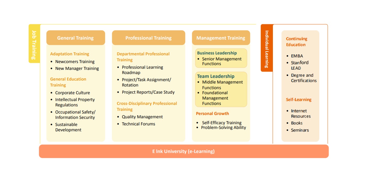 Inkers are also encouraged to seek learning opportunities or resources by themselves with assistance from E Ink University through specialized external courses, books, articles and pod-casts.