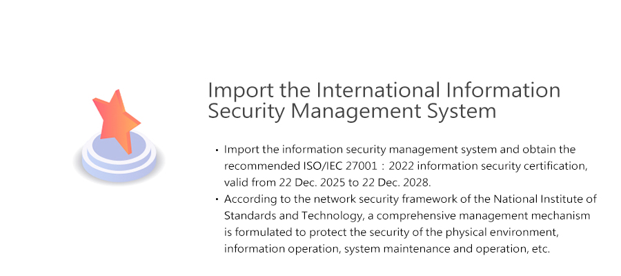 ‧ The company shall continuously allocate necessary resources to its Information Security Management System (ISMS), establish management standards and processes, and ensure alignment with international standards and business requirements.