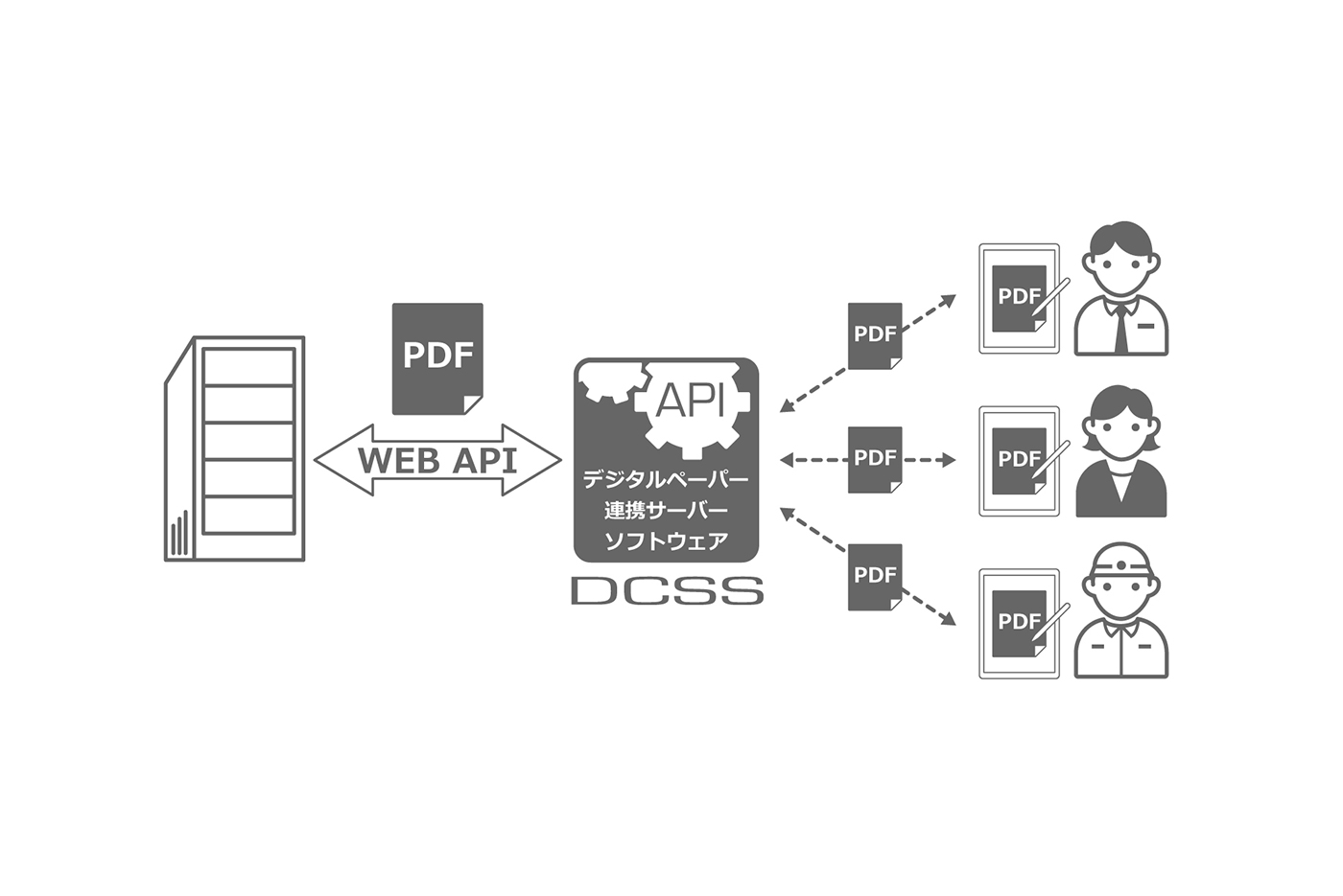 By using the DCSS, a solution with which an existing business system transfers PDF files to a plurality of Digital Paper devices, or collects documents from a specific Digital Paper device can be realized.
